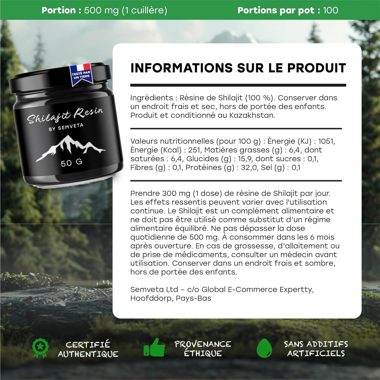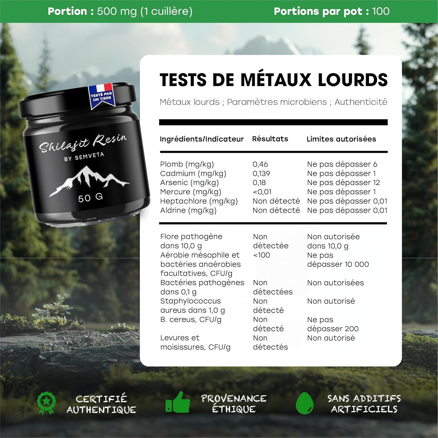 - 💪 Riche en Minéraux, Vitamines et Micronutriments: Le Shilajit est naturellement riche en ces éléments essentiels. Notre Shilajit est testé pour les métaux lourds pour votre tranquillité d’esprit.