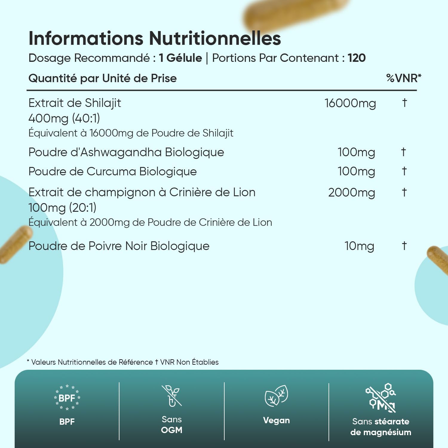- Richesse du Shilajit Complexe – Comparé au Shilajit pure ou aux gélules de Shilajit himalya bio, ce complexe de gélules est enrichi en Ashwagandha Bio, Curcuma Bio, Champignon Crinière de Lion et Poivre Noir pour une synergie. De plus, contrairement à la résine de Shilajit, ces gélules sont pratiques à prendre et transporter ainsi que sans saveur.