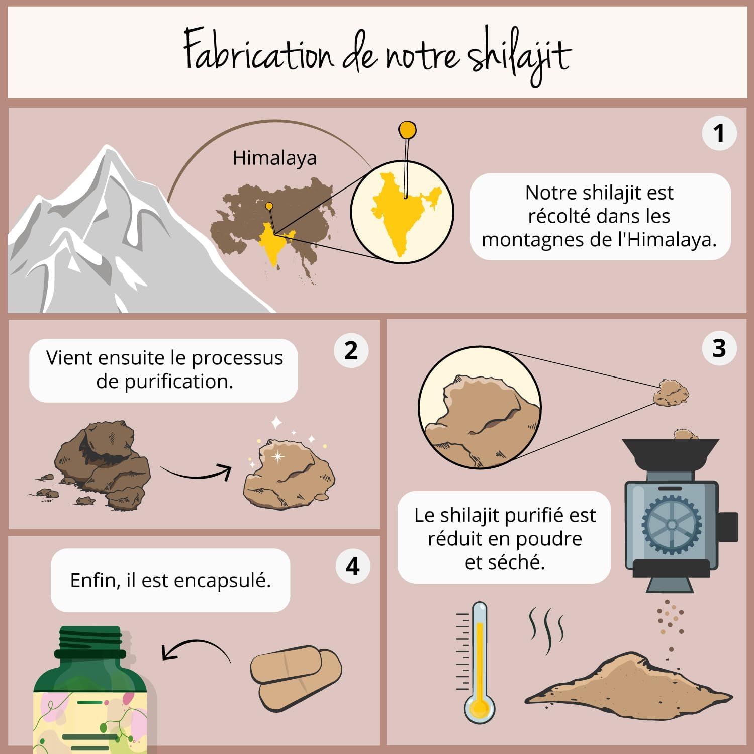 Pour notre produit, nous avons donc choisi un extrait indien de haute qualité standardisé à 60% d’acides fulviques et 12% d’acides humiques. Les roches contenant le Shilajiit sont soumises à un contrôle de qualité, échantillonnées, nettoyées, pulvérisées et tamisées. Après l’extraction et la purification, la substance est séchée pour garantir sa pureté avant que les tests analytiques finaux et le contrôle de qualité ne soient effectués. Notre complément végétalien ne contient aucun additif.