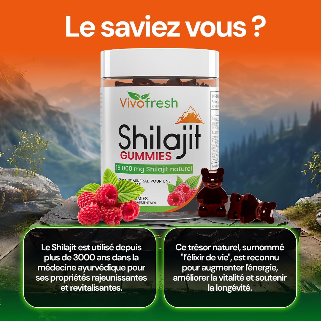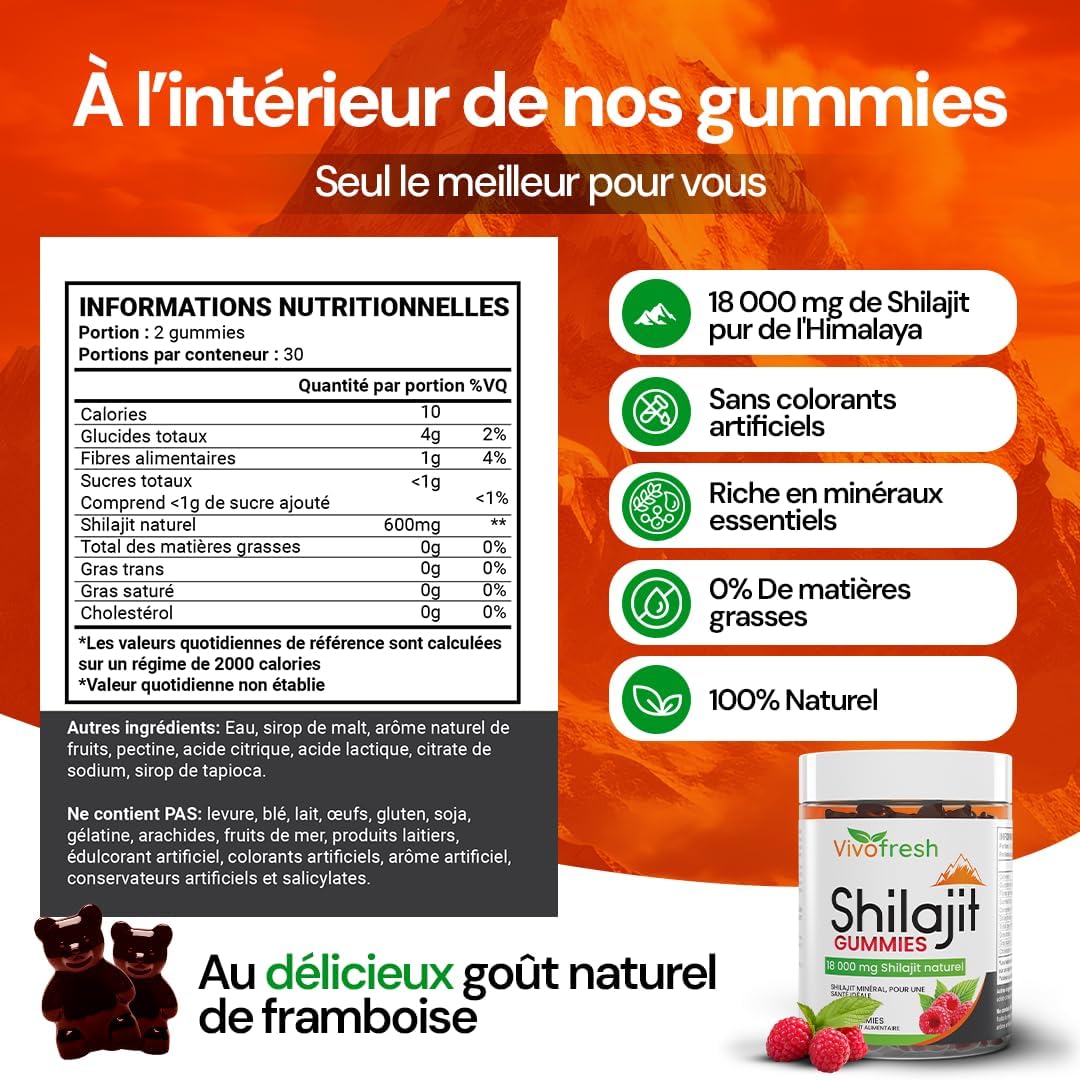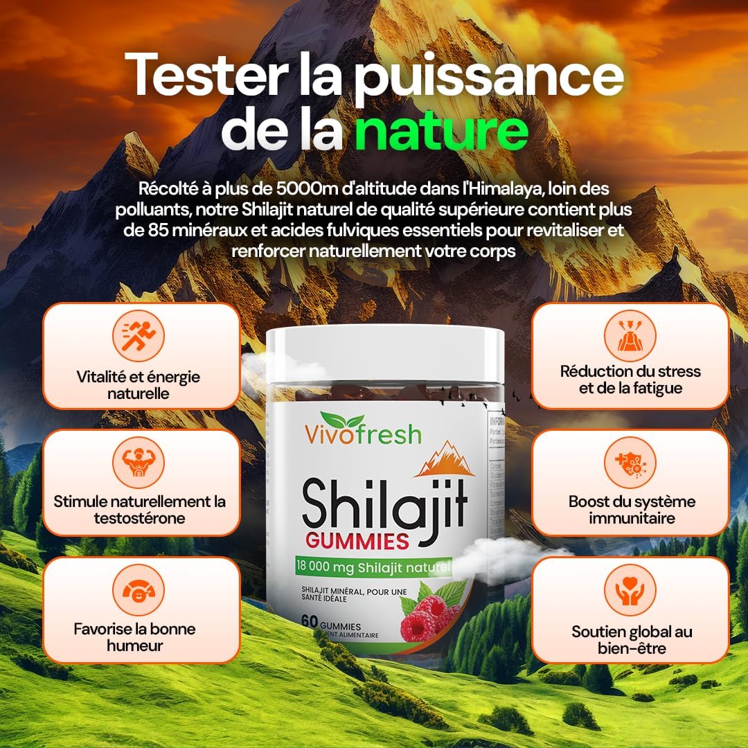 VivoFresh Shilajit Pur Himalaya | Boost d’Énergie Naturelle | 85 Minéraux & Acides Fulviques | Goût Framboise Délicieux | 60 Gummies – 18 000 mg